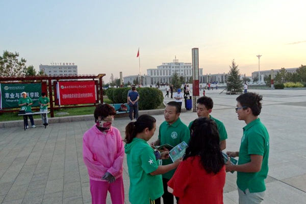 团队提前三十分钟到达会场做好了准备活动,布置好会场,在落日的余晖沐浴下,全体队员开展了本次的活动。首先,广场上的人流量并不是很大,队伍决定前往广场的各个方位宣传学院以及本次队伍的目的与意义,召集更多的人来到会场所在地,从而进一步进行宣传。在和当地人民交流的过程中,队员面临着语言不通的问题,大部分年龄较大的牧民普通话并不是很好,幸好在前往宣传之前队伍准备好了双语宣传册,通过分发蒙语宣传册再加上指引,让熟悉蒙文的队员加以解释说明,也起到了很好的宣传效果。