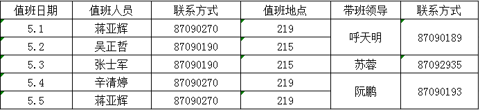 备注:1. 值班时间:上午8:30—11:30,下午2:30—5:30 。